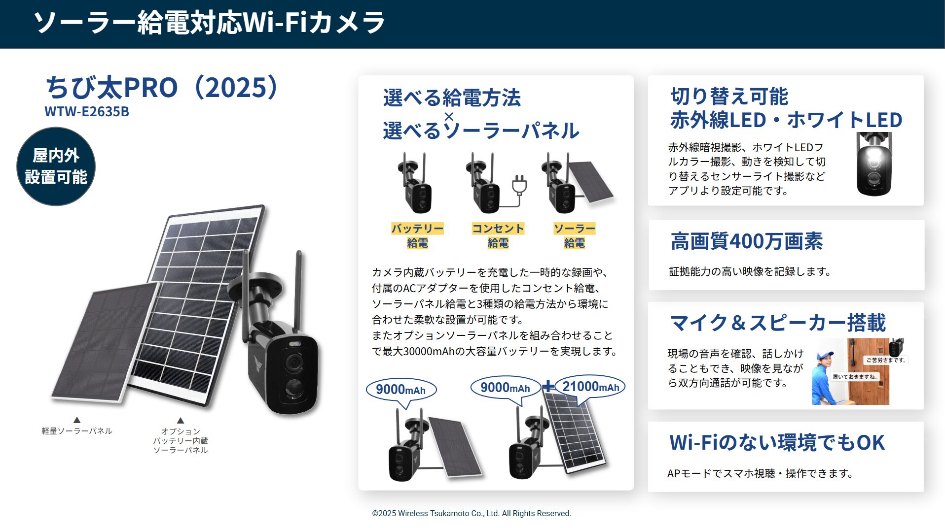 大容量ソーラーバッテリー搭載で電源不要